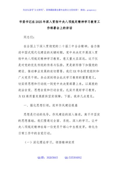 / 市委书记在2025年深入贯彻中央八项规定精神学习教育工作部署会上的讲话