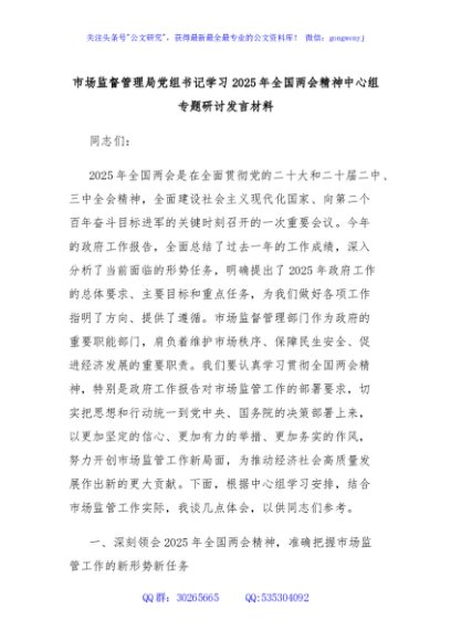 / 市场监督管理局党组书记学习2025年全国两会精神中心组专题研讨发言材料
