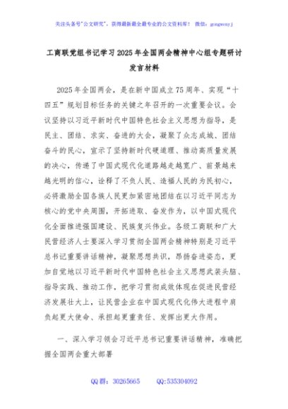 / 工商联党组书记学习2025年全国两会精神中心组专题研讨发言材料