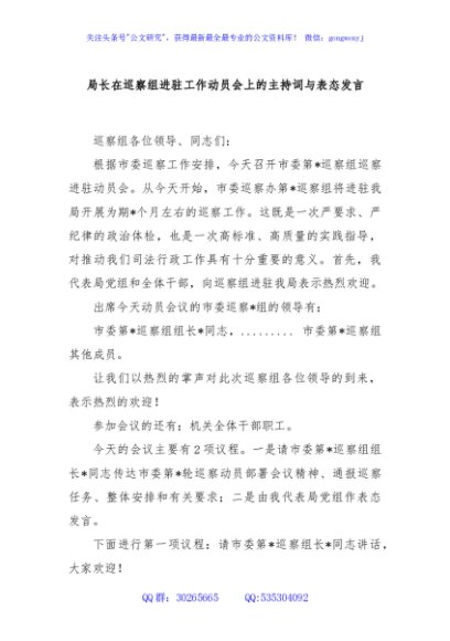/ 局长在巡察组进驻工作动员会上的主持词与表态发言