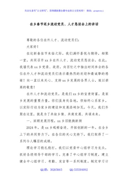 / 在乡春节返乡流动党员、人才恳谈会上的讲话