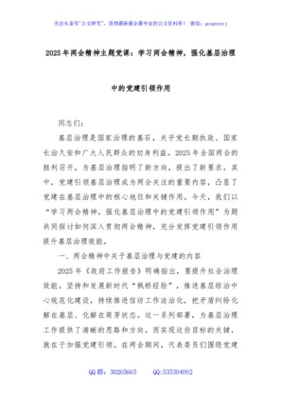 / 2025年两会精神主题党课:学习两会精神,强化基层治理中的党建引领作用