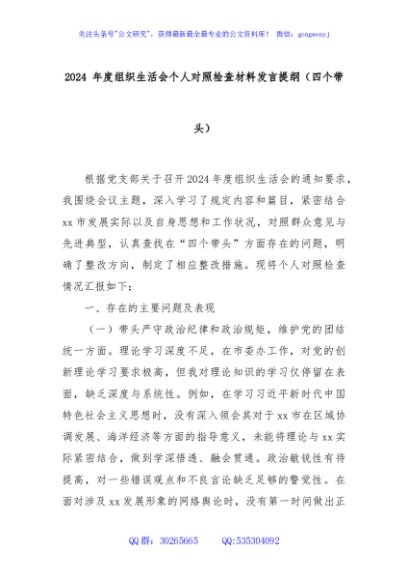 / 2024 年度组织生活会个人对照检查材料发言提纲(四个带头)