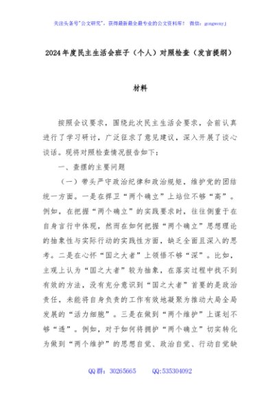 2024年度民主生活会班子(个人)对照检查(发言提纲)材料