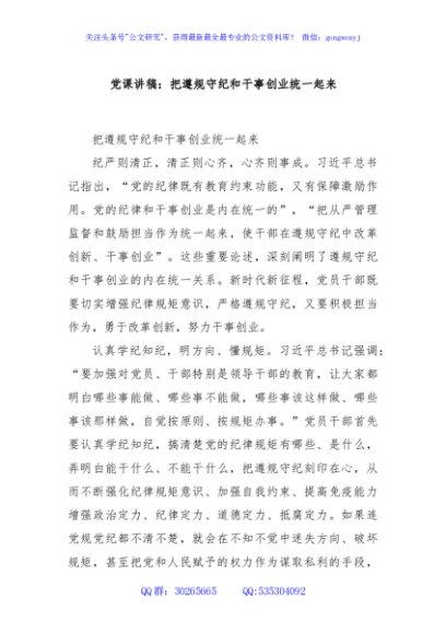 / 党课讲稿:把遵规守纪和干事创业统一起来