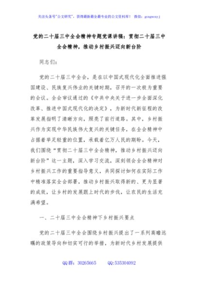 / 党的二十届三中全会精神专题党课讲稿:贯彻二十届三中全会精神,推动乡村振兴迈向新台阶