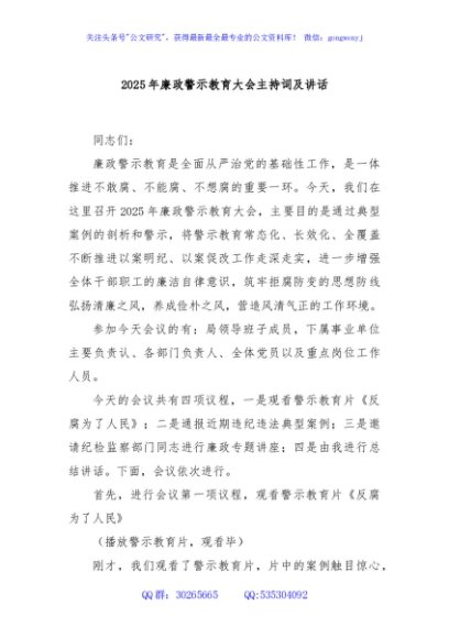 / 2025年廉政警示教育大会主持词及讲话