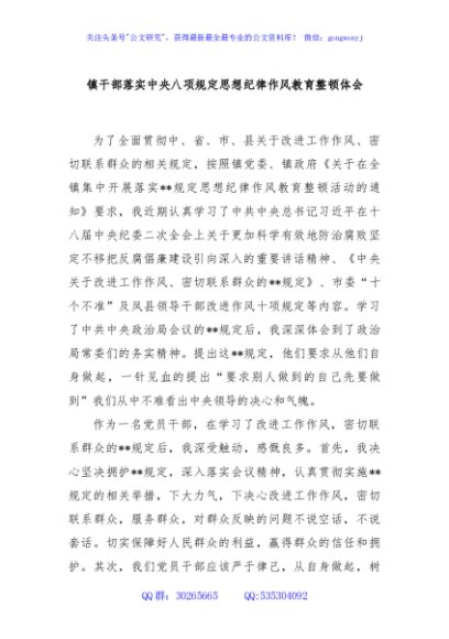 / 镇干部落实中央八项规定思想纪律作风教育整顿体会