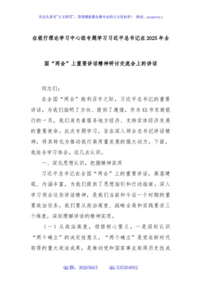 / 在银行理论学习中心组专题学习习近平总书记在2025年全国“两会”上重要讲话精神研讨交流会上的讲话