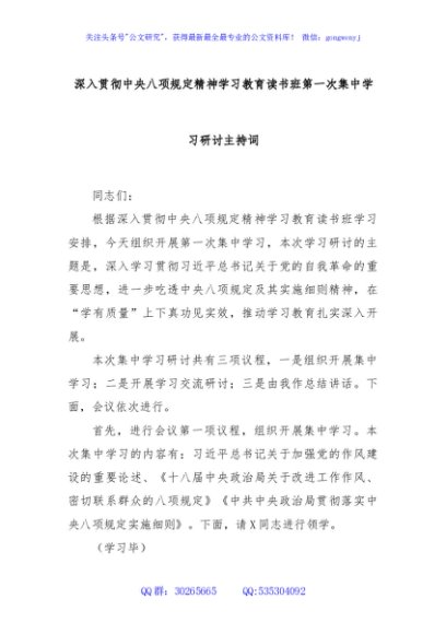 / 深入贯彻中央八项规定精神学习教育读书班第一次集中学习研讨主持词
