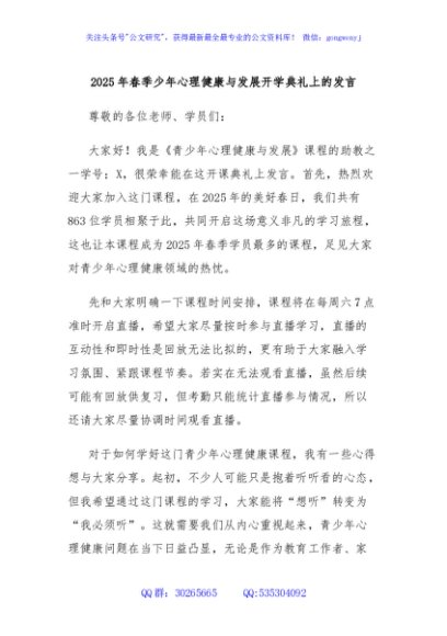 / 2025年春季少年心理健康与发展开学典礼上的发言