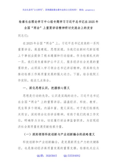 / 检察长在理论学习中心组专题学习习近平总书记在2025年全国“两会”上重要讲话精神研讨交流会上的发言