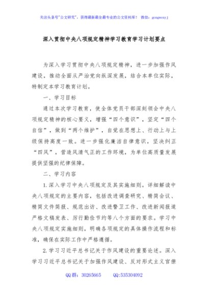 / 深入贯彻中央八项规定精神学习教育学习计划要点
