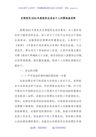 / 支部党员2024年度组织生活会个人对照检查材料