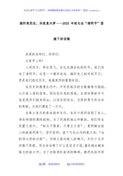 / 缅怀英烈志,共筑复兴梦——2025 年校长在“清明节”国旗下讲话稿