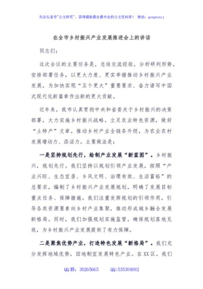 / 在全市乡村振兴产业发展推进会上的讲话