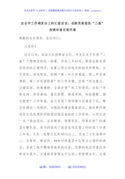 在全市工作调度会上的汇报发言:创新思路狠抓“三基”构建和谐交通环境