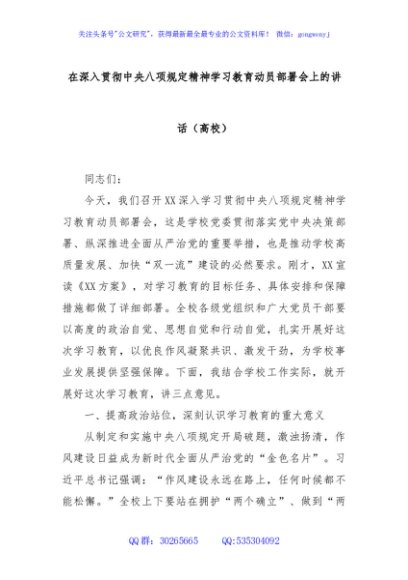 / 在深入贯彻中央八项规定精神学习教育动员部署会上的讲话(高校)