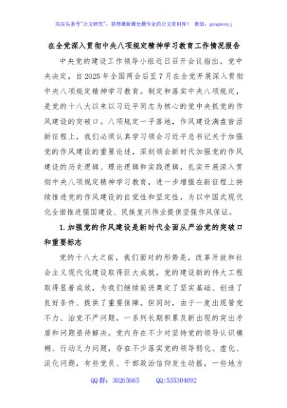 / 在全党深入贯彻中央八项规定精神学习教育工作情况报告