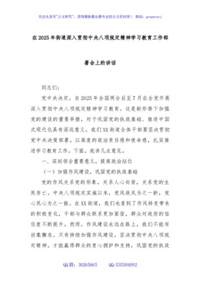 / 在2025年街道深入贯彻中央八项规定精神学习教育工作部署会上的讲话