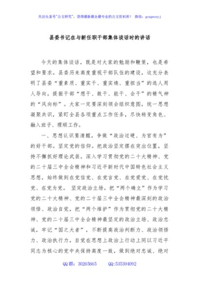 / 县委书记在与新任职干部集体谈话时的讲话