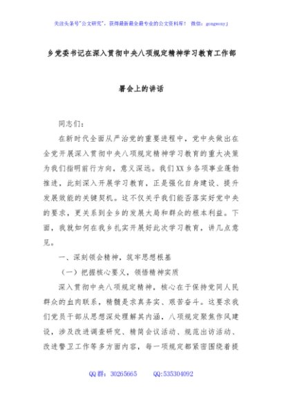/ 乡党委书记在深入贯彻中央八项规定精神学习教育工作部署会上的讲话