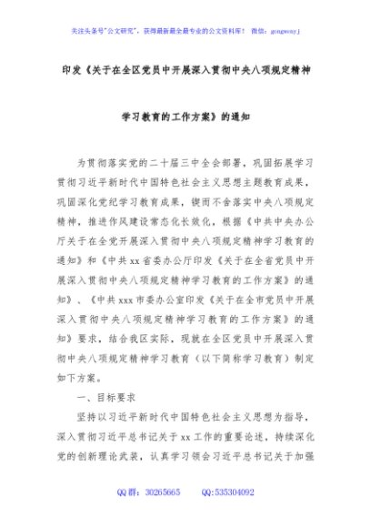 / 印发《关于在全区党员中开展深入贯彻中央八项规定精神学习教育的工作方案》的通知