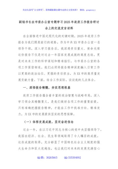 / 副秘书长在市委办公室专题学习2025年政府工作报告研讨会上的交流发言材料