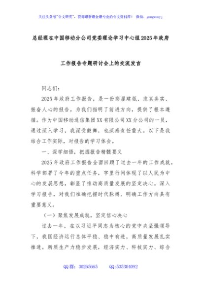 / 总经理在中国移动分公司党委理论学习中心组2025年政府工作报告专题研讨会上的交流发言