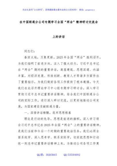 / 在中国联通分公司专题学习全国“两会”精神研讨交流会上的讲话