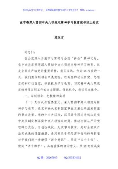 / 在市委深入贯彻中央八项规定精神学习教育读书班上的交流发言