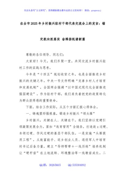 / 在全市2025年乡村振兴驻村干部代表交流会上的发言:锚定航向抓落实 奋楫扬帆谱新篇