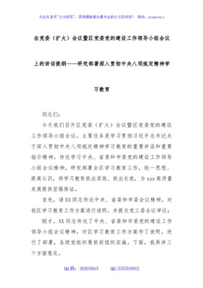 / 在党委(扩大)会议暨区党委党的建设工作领导小组会议上的讲话提纲——研究部署深入贯彻中央八项规定精神学习教育
