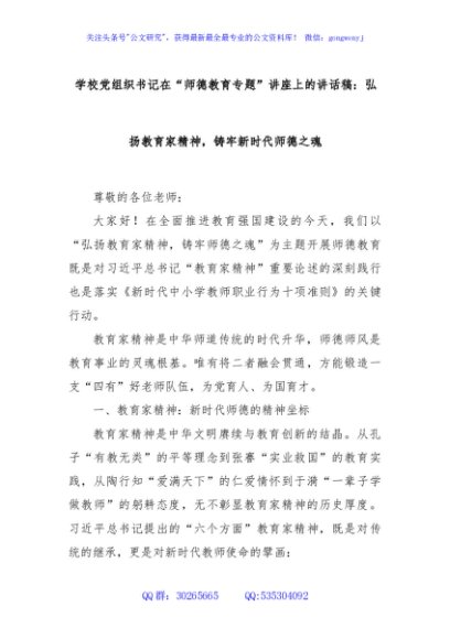 / 学校党组织书记在“师德教育专题”讲座上的讲话稿:弘扬教育家精神,铸牢新时代师德之魂