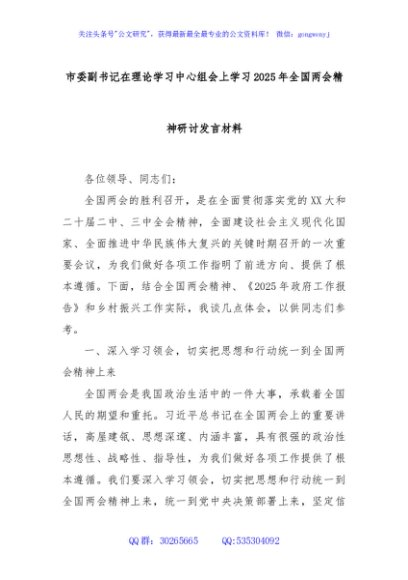 / 市委副书记在理论学习中心组会上学习2025年全国两会精神研讨发言材料