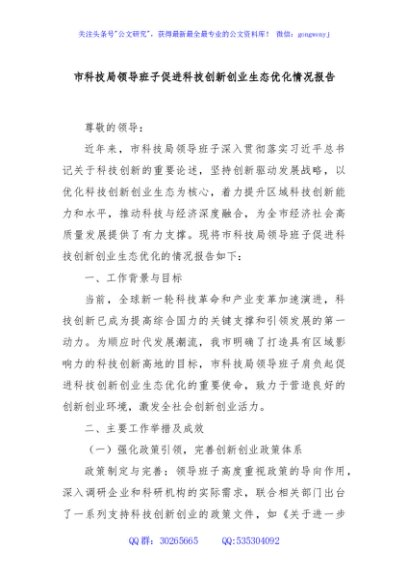 / 市科技局领导班子促进科技创新创业生态优化情况报告