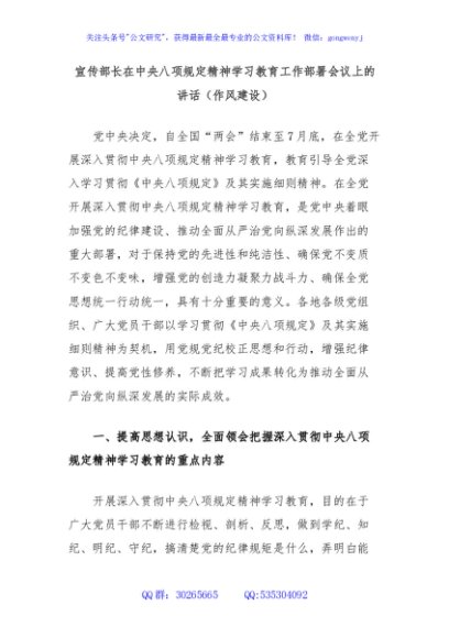 / 宣传部长在中央八项规定精神学习教育工作部署会议上的讲话(作风建设)