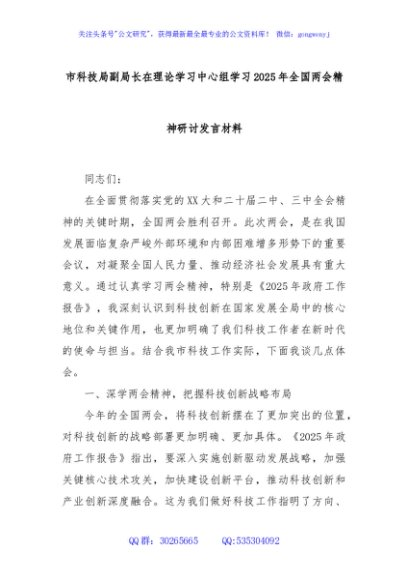 / 市科技局副局长在理论学习中心组学习2025年全国两会精神研讨发言材料