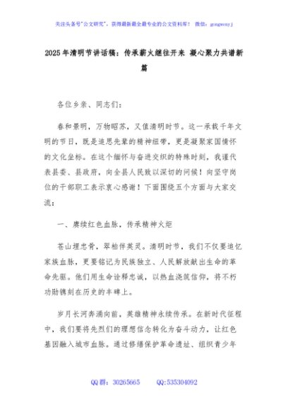 / 2025年清明节讲话稿:传承薪火继往开来 凝心聚力共谱新篇