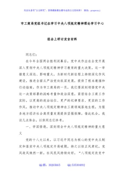 / 市工商局党组书记在学习中央八项规定精神理论学习中心组会上研讨发言材料