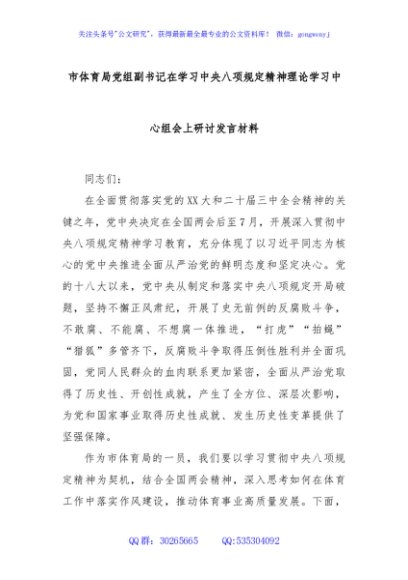 / 市体育局党组副书记在学习中央八项规定精神理论学习中心组会上研讨发言材料