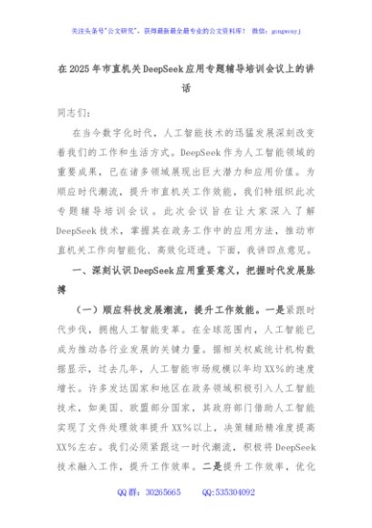 / 在2025年市直机关DeepSeek应用专题辅导培训会议上的讲话