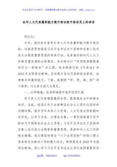 / 在市人大代表履职能力提升培训班开班动员上的讲话