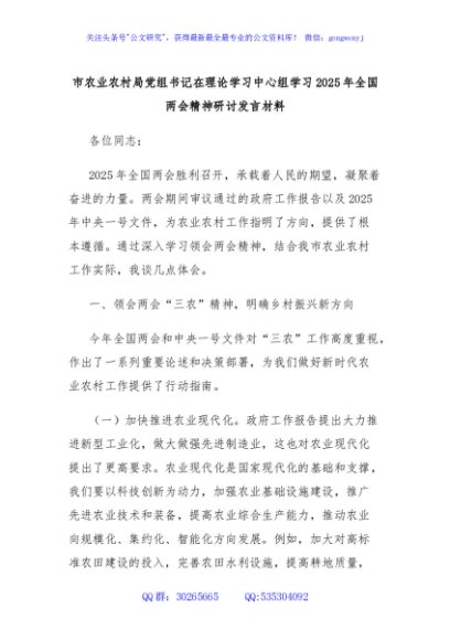 / 市农业农村局党组书记在理论学习中心组学习2025年全国两会精神研讨发言材料
