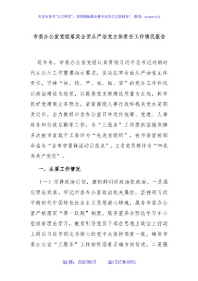 / 市委办公室党组落实全面从严治党主体责任工作情况报告