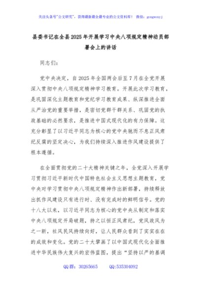 / 县委书记在全县2025年开展学习中央八项规定精神动员部署会上的讲话