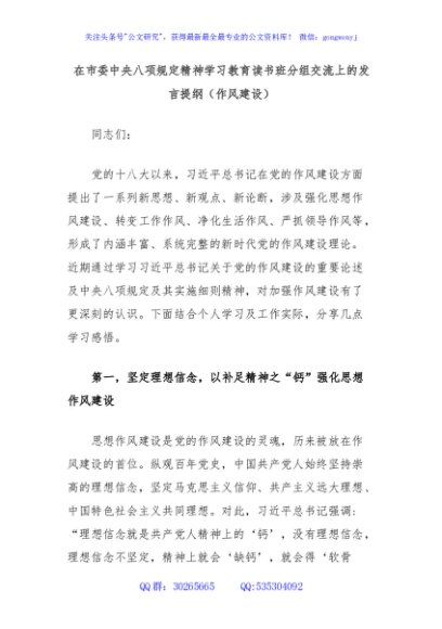 / 在市委中央八项规定精神学习教育读书班分组交流上的发言提纲(作风建设)