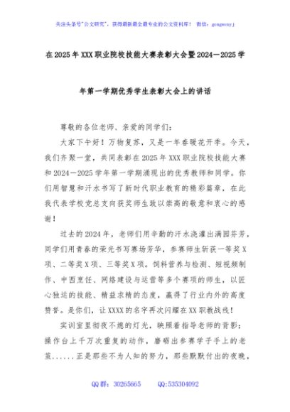 / 在2025年XXX职业院校技能大赛表彰大会暨2024-2025学年第一学期优秀学生表彰大会上的讲话