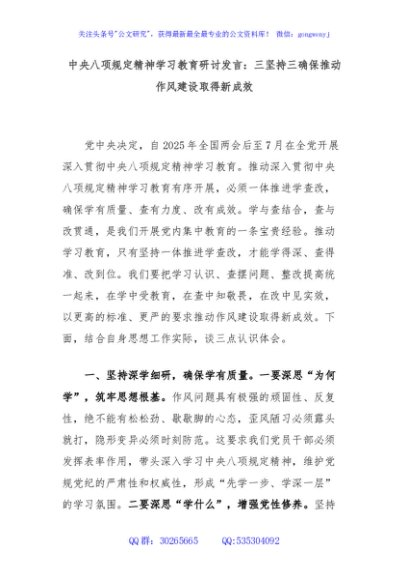 / 中央八项规定精神学习教育研讨发言:三坚持三确保推动作风建设取得新成效