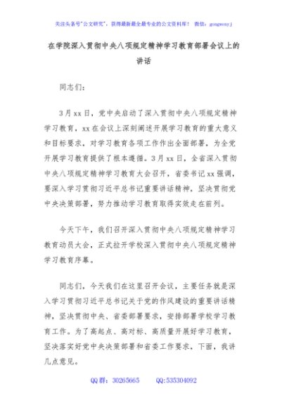 / 在学院深入贯彻中央八项规定精神学习教育部署会议上的讲话